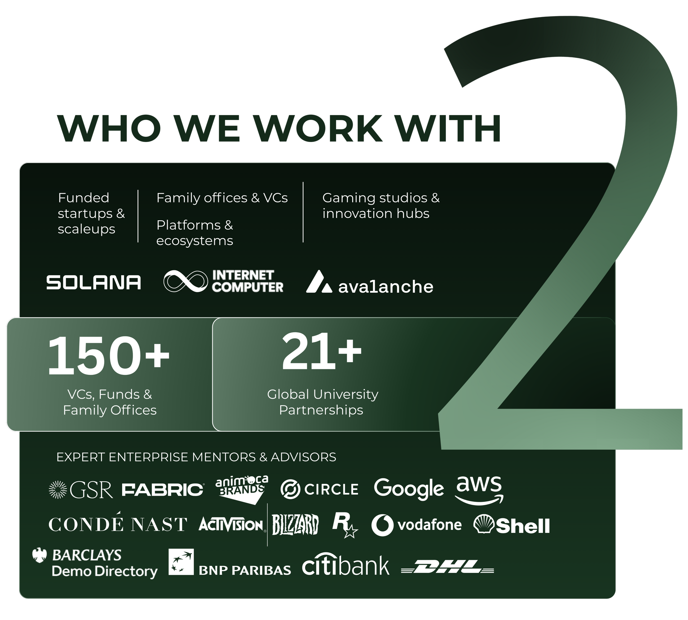 Our accelerators and advisory programs connect the dots between leading ecosystem partners and world-renowned enterprises, bringing the best to the best, culminating in high-impact Demo Days with top VCs, angels, and family offices.
